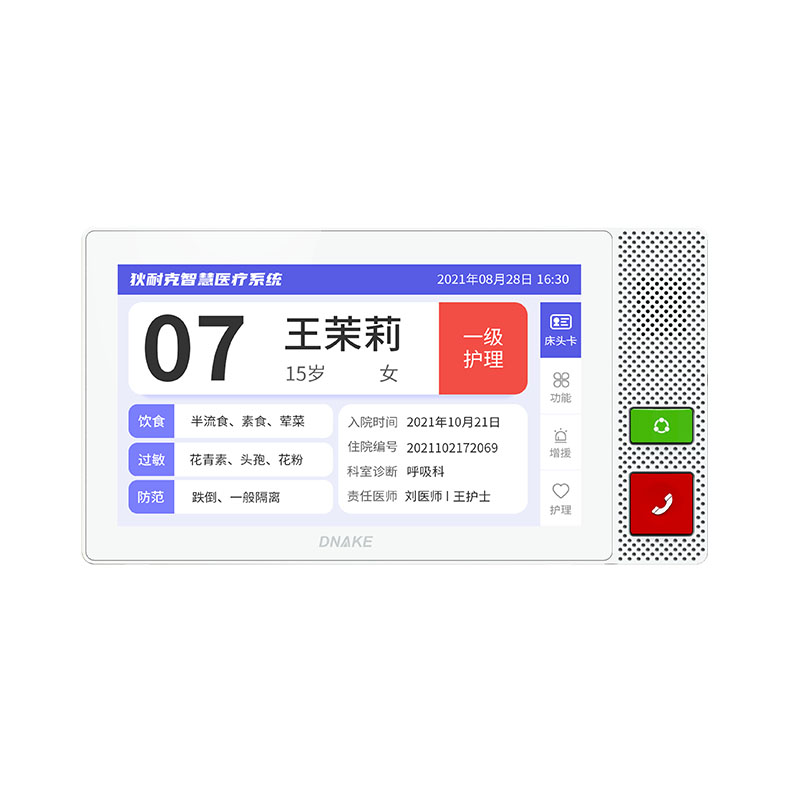 創(chuàng)新安裝在病床頭的交互設(shè)備機(jī),代替?zhèn)鹘y(tǒng)紙質(zhì)卡。產(chǎn)品支持呼叫對(duì)講、為住院患者提供病例查詢、狀態(tài)自動(dòng)提醒等護(hù)理需求等。